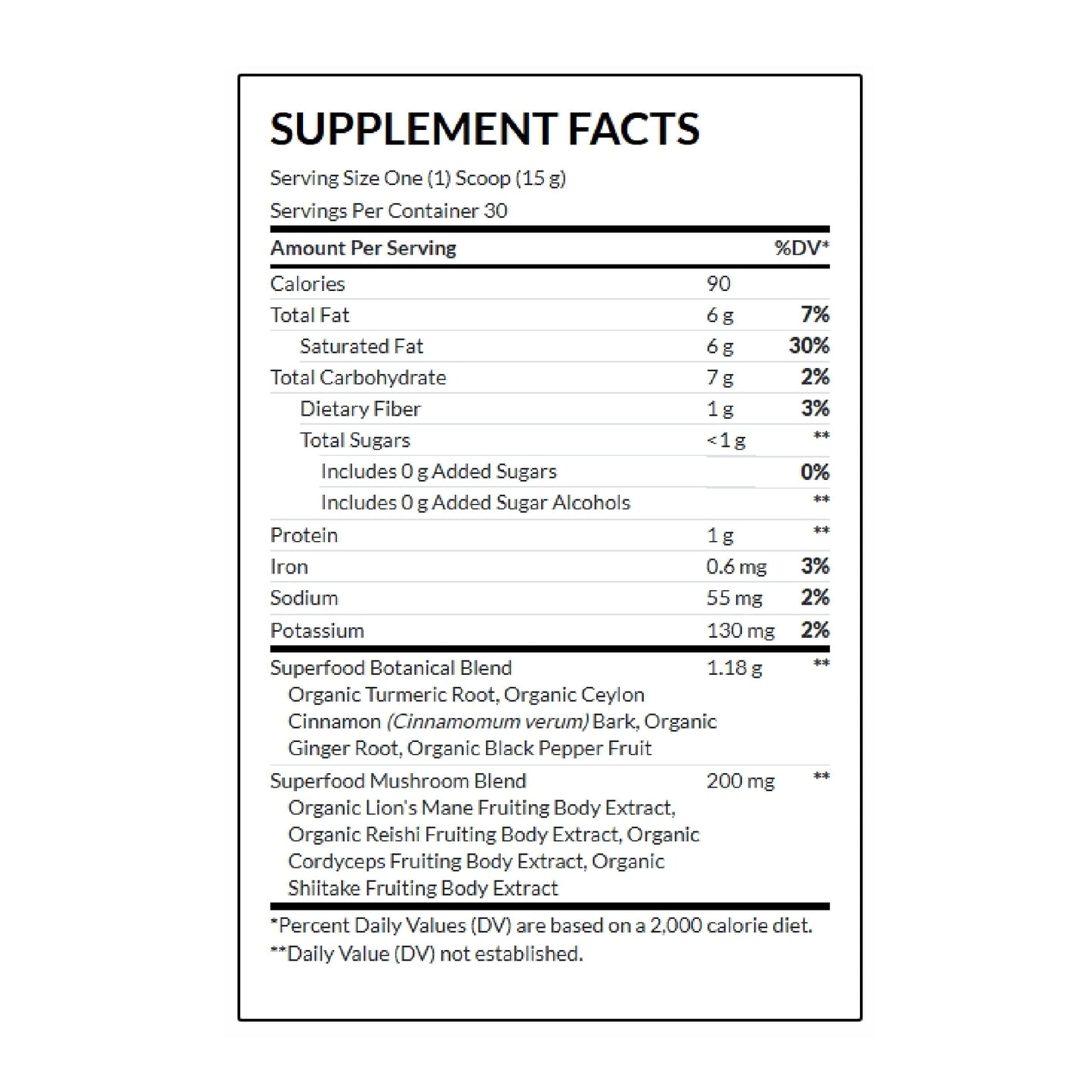 It combines the soothing benefits of turmeric with a variety of other nourishing, certified organic superfoods like coconut milk, MCT oil from coconuts, ginger, ceylon cinnamon, black pepper, himalayan pink salt, and monk fruit.
