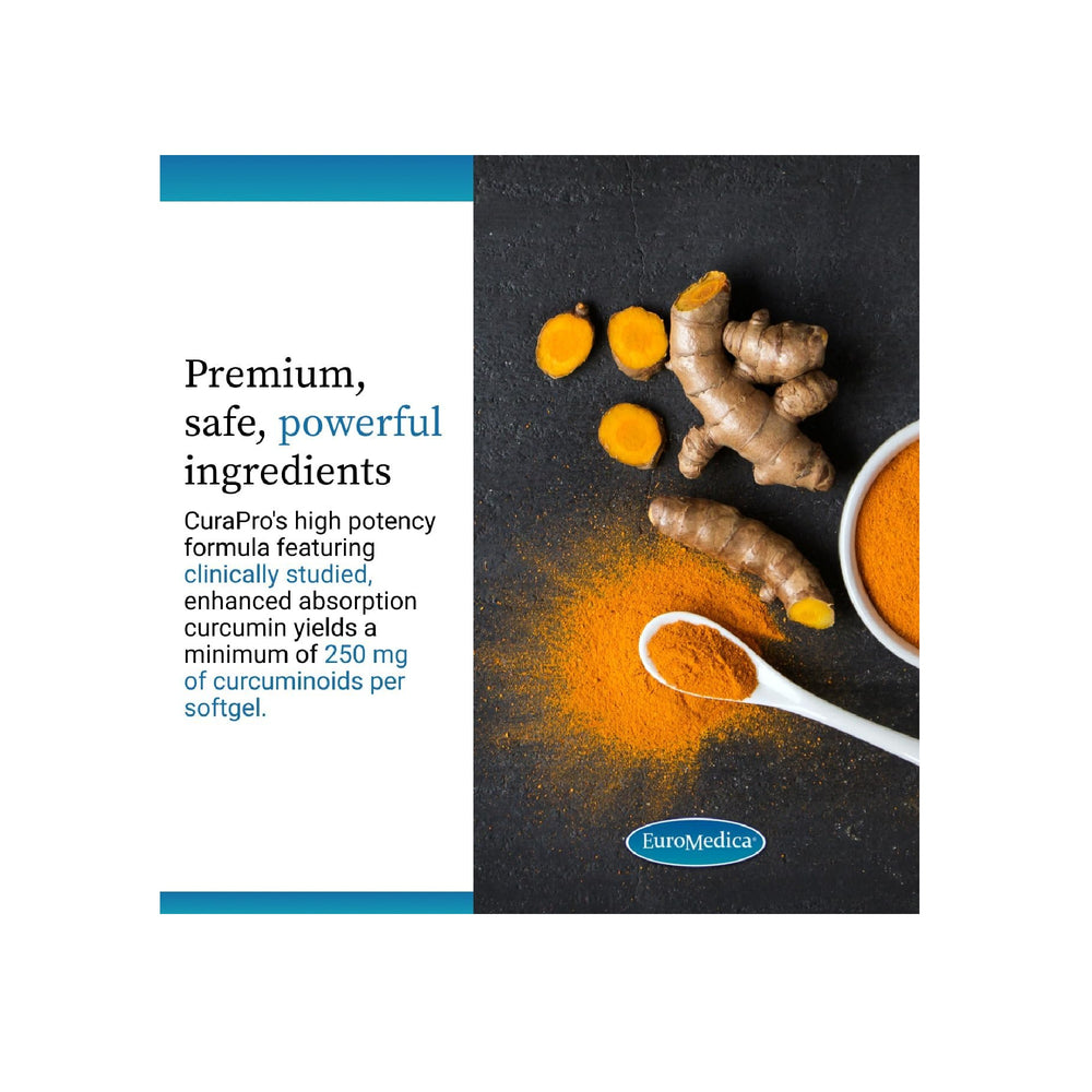 CuraPro delivers up to 500 times more curcumin to the bloodstream than turmeric, and has a sustained retention time at significant levels in the bloodstream.† This high-potency formula, featuring a clinically studied, bioavailable curcumin, yields a minimum of 500 mg of curcuminoids per softgel.