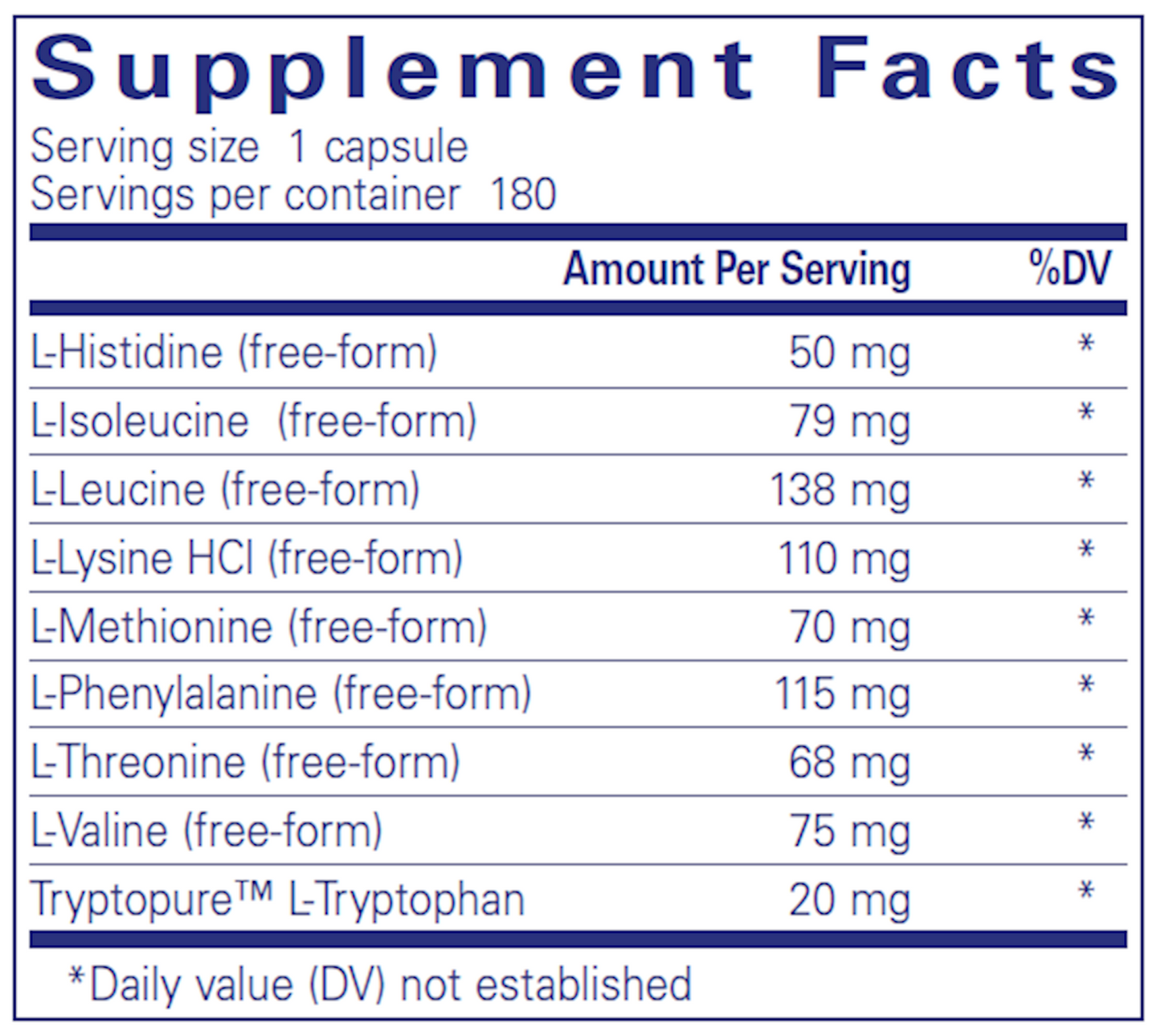 Those that need to be obtained from exogenous sources are referred to as the essential amino acids. Pure Encapsulations’ Essential Aminos formula is based on the ratios of essential amino acids from high biological value (BV) protein sources. Proper intake of these amino acids is important for the synthesis, repair, and metabolism of muscle, cells, and tissues.*