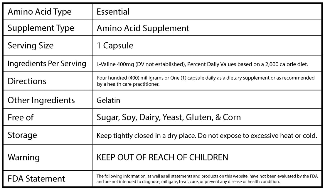 Jo Mar's L-Valine is 100% pure U.S.P. grade crystalline free form. The powder is not water soluble, has a bitter-sweet taste and weighs about 3.8 grams per level measuring teaspoon.