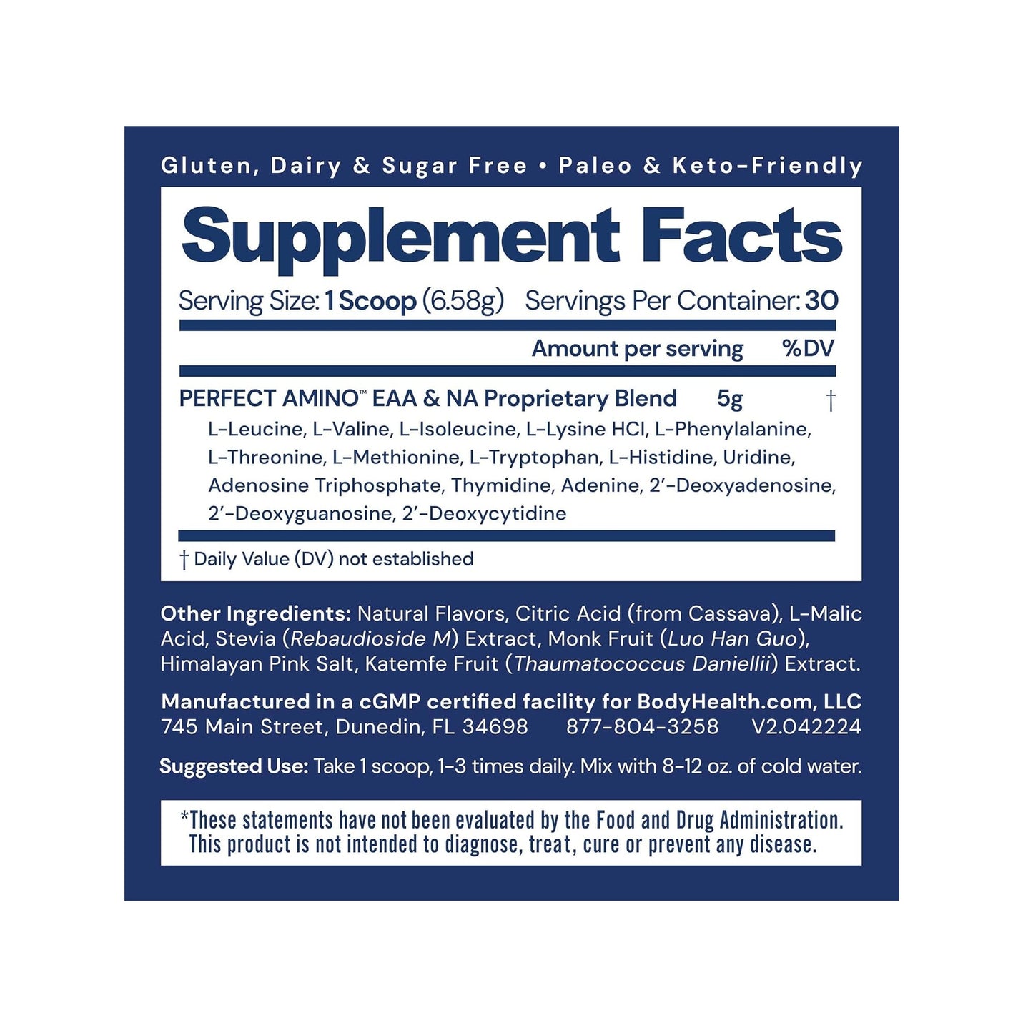 PerfectAmino® contains the eight essential amino acids the body needs to support and maintain its muscular, skeletal, enzymatic, and hormonal systems. The essential amino acids in PerfectAmino are in the exact proportions needed for maximum utilization by the body.