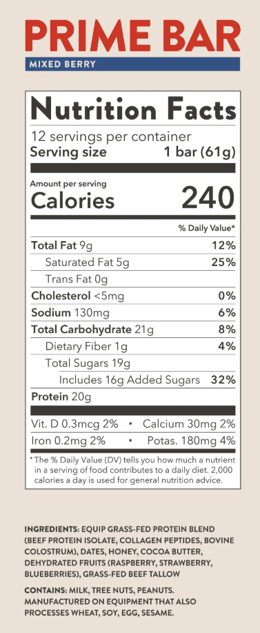 We’re known for our Prime Protein, grass-fed beef protein powder with only quality ingredients that tastes like dessert. We spent years developing a delicious, high-quality protein bar using our grass-fed beef as the primary protein source to give customers the Prime Protein they love in a convenient and delicious bar form – perfect for a satiating, quick snack on the go!