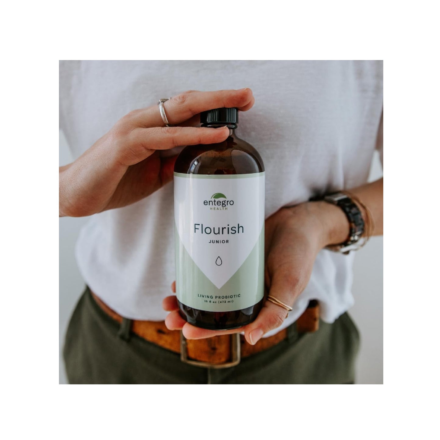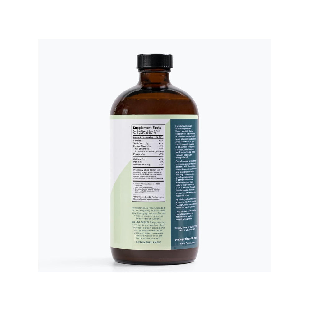 Flourish Junior is an artisanal crafted living probiotic that remains in the most natural liquid form. The all-natural fermentation process provides the good bacteria with all the nutrition needed to continue to live, thrive, and multiply even after bottling. Flourish Junior has the same bacteria and concentration as Flourish Original so all dosing remains the same. Grown in sweet Sorghum, Flourish Junior has a sweeter, apple cider-like taste.