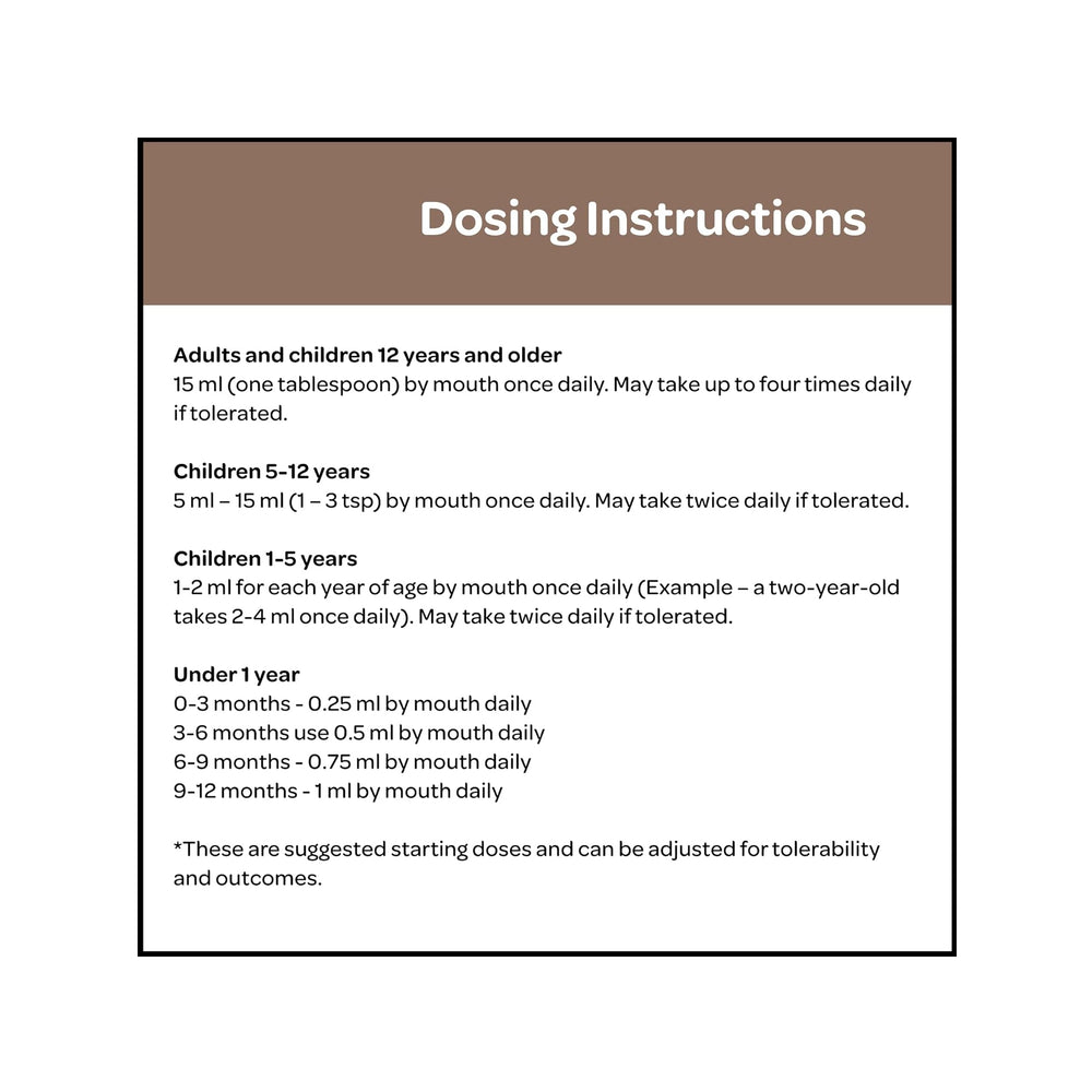 1-2ml for each year of age by mouth once daily (Example – a two-year-old takes 2-4 ml once daily). May take twice daily if tolerated.