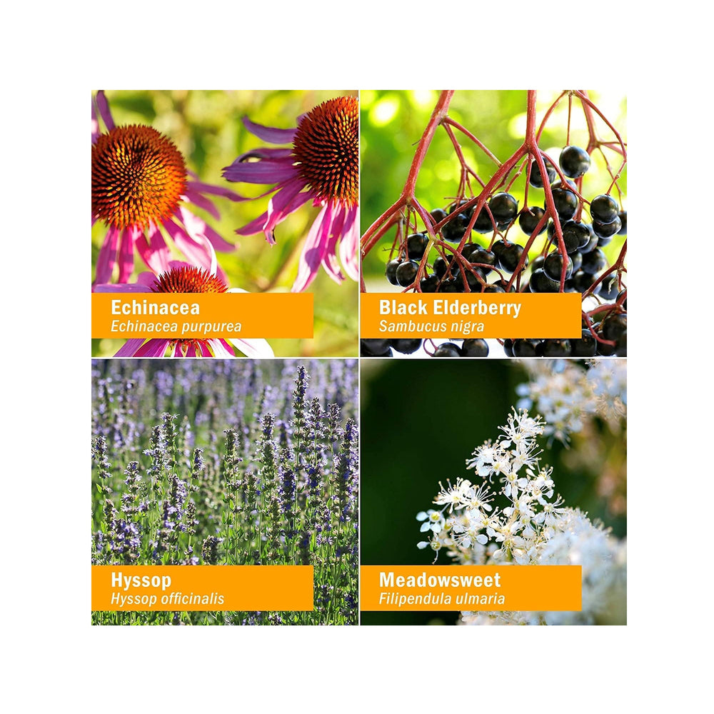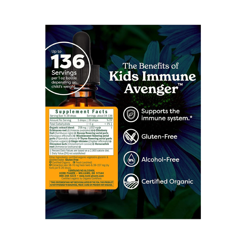 Kids Immune Avenger features Echinacea extract produced from the root of Certified Organic Echinacea purpurea plants. It also includes Black Elderberry extract prepared from the fully ripened berries of Certified Organic Sambucus nigra trees.