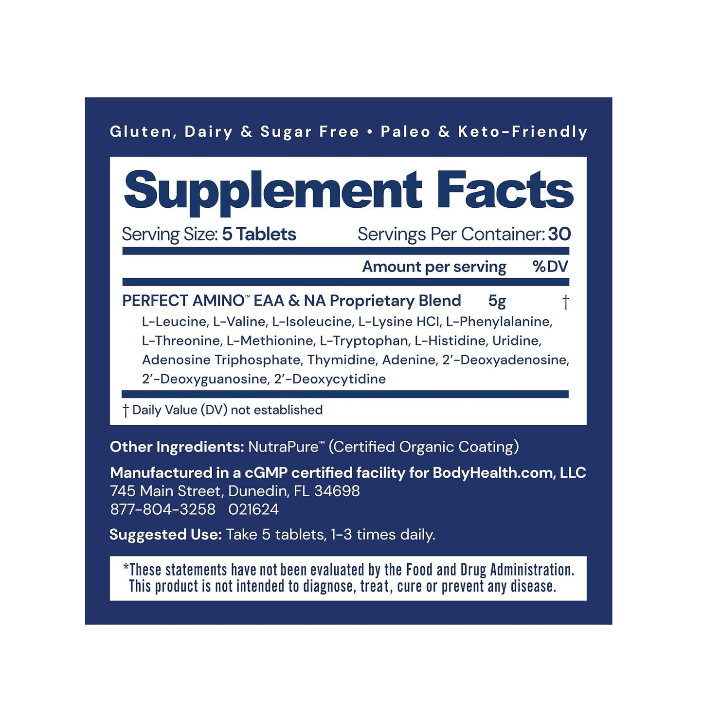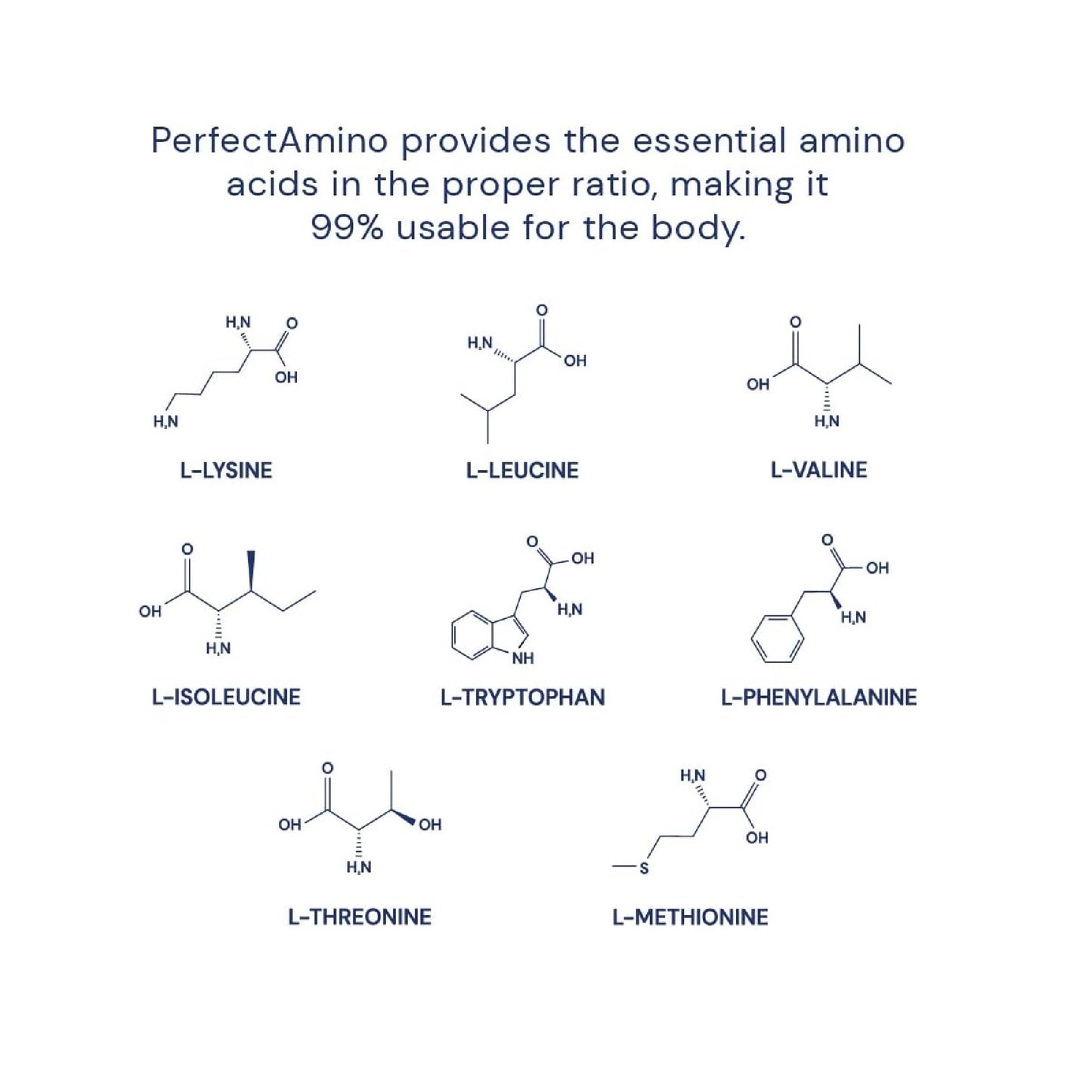 PerfectAmino® contains the eight essential amino acids the body needs to support and maintain its muscular, skeletal, enzymatic, and hormonal systems. The essential amino acids in PerfectAmino are in the exact proportions needed for maximum utilization by the body.