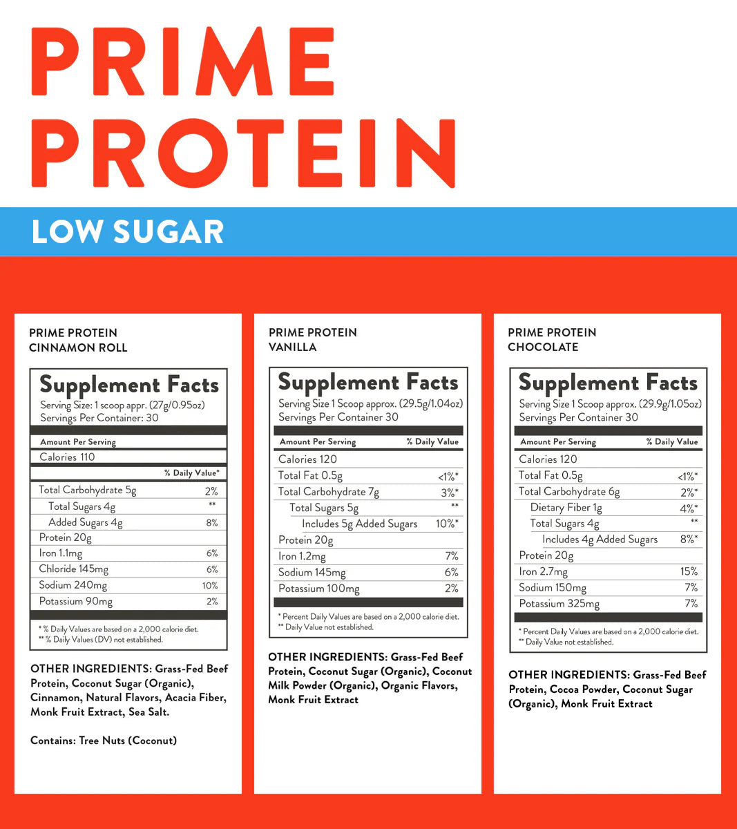 Every serving of Prime Protein contains 4 oz of grass-fed beef. That’s 21g of protein and absolutely no sugars. We use stevia to sweeten our flavored blends but Unflavored Prime is stevia-free.