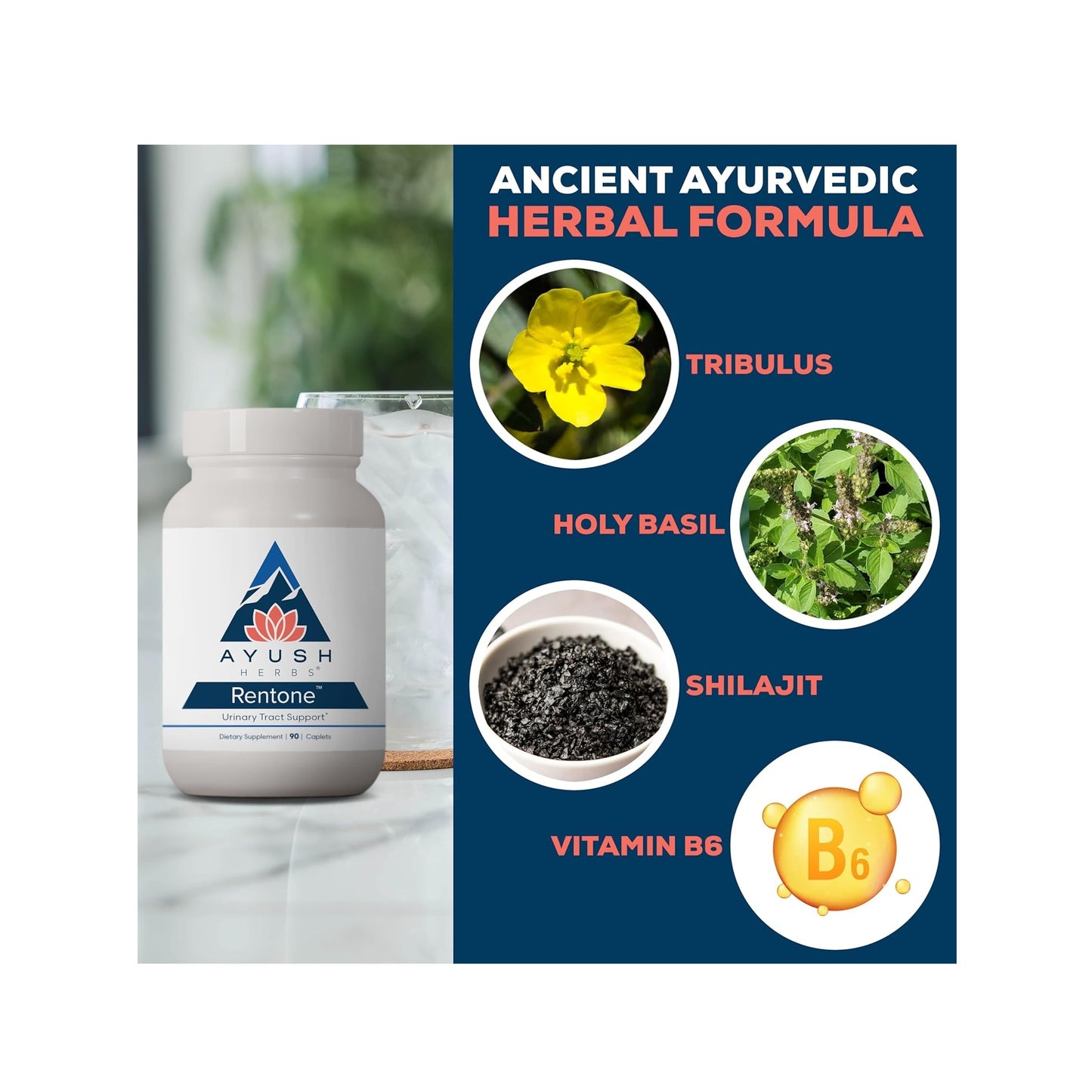 Rentone™ is a unique formula for kidney and urinary support that we have put together at Ayush using a combination of Eastern and Western herbs, in addition to other nutrients that improve the effectiveness of the elimination system. Didymocarpus pedicellata is an Ayurvedic herb also known as pathar phori. Saxifraga ligulata, and Tribulus terrestris are known for having kidney supporting function. Ocimum sanctum (holy basil) is used in the formulation for its immune-supportive properties. Shilajit is an asphaltum (mineral pitch) obtained in the Himalayan region of India and is considered a rasayana (adaptogen). Shilajit contains at least 85 minerals in ionic form and has been used traditionally for centuries for genitourinary and immune support, as well as for its aphrodisiac properties. Arctostaphylos uva-ursi is a European herb, the leaves of which contain 10% of the bioavailable principle, arbutin, which splits into glucose and hydroquinone in the kidneys.