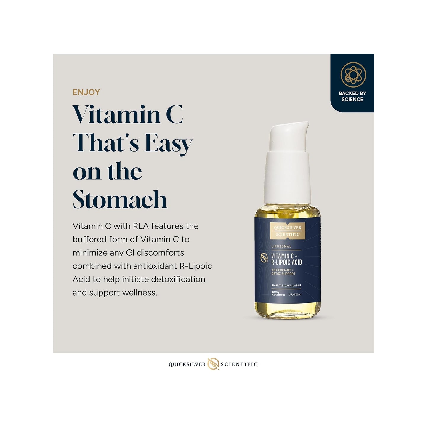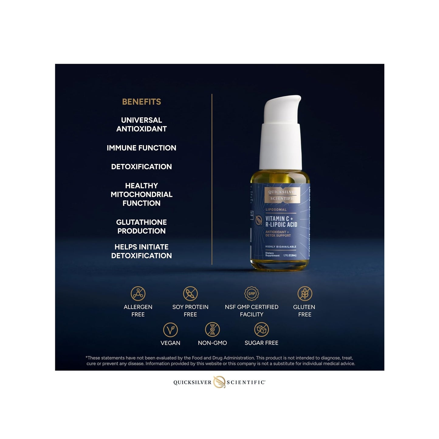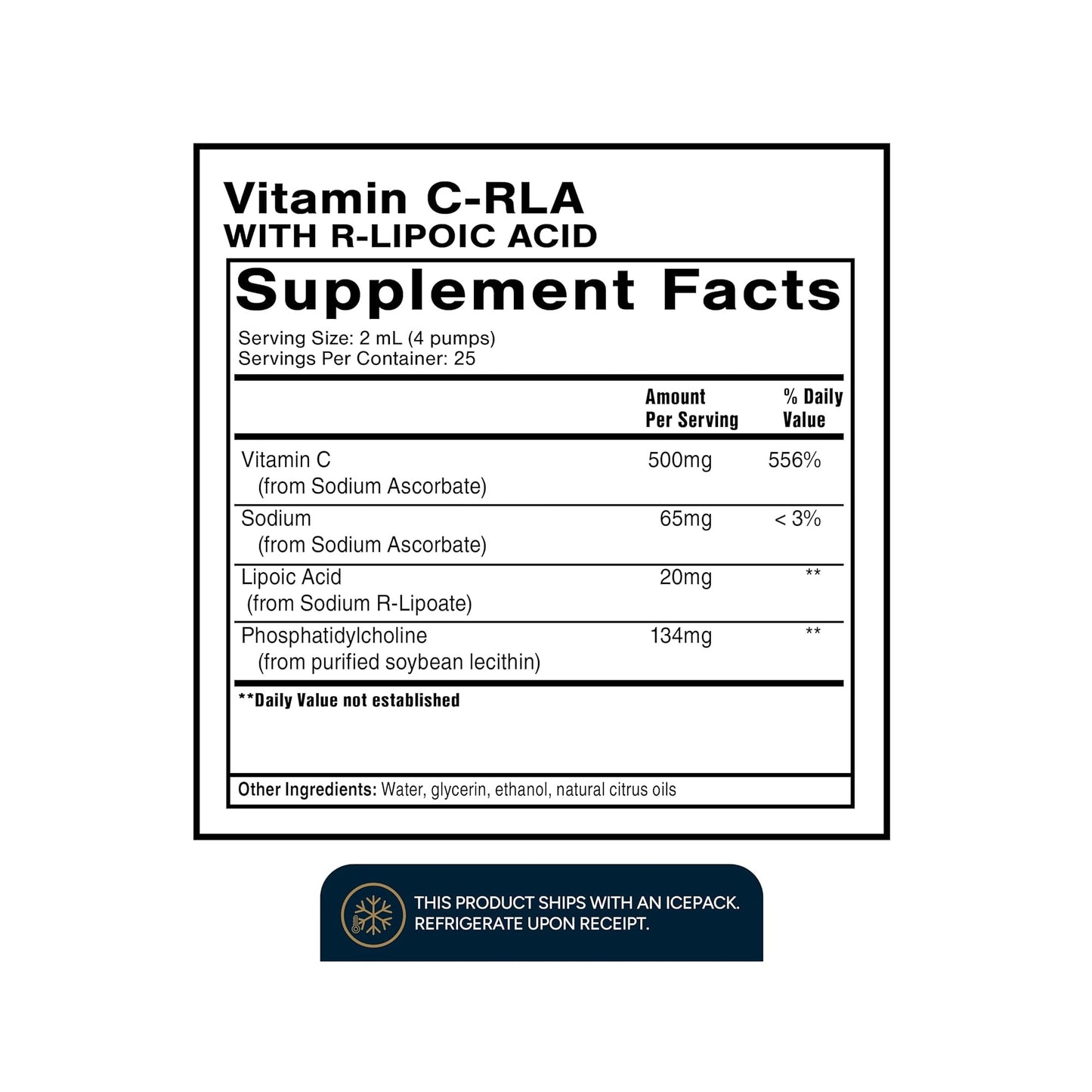 Each 2 mL of Liposomal Vitamin C with R-Lipoic Acid delivers 65mg of sodium, 500mg of Quali®-C Vitamin C, and 25 mg of Sodium R-Lipoate. A serving size is 4 pumps. Each bottle contains 25 servings.