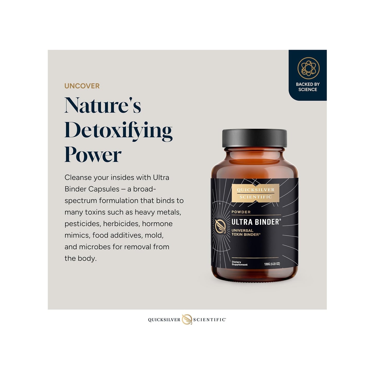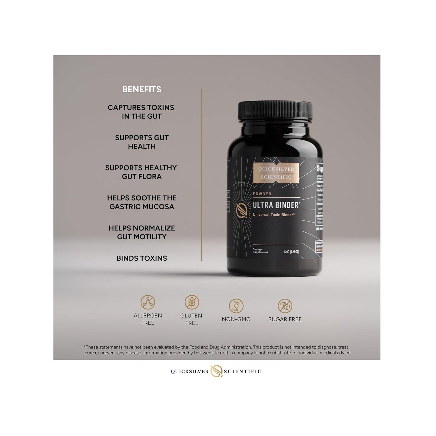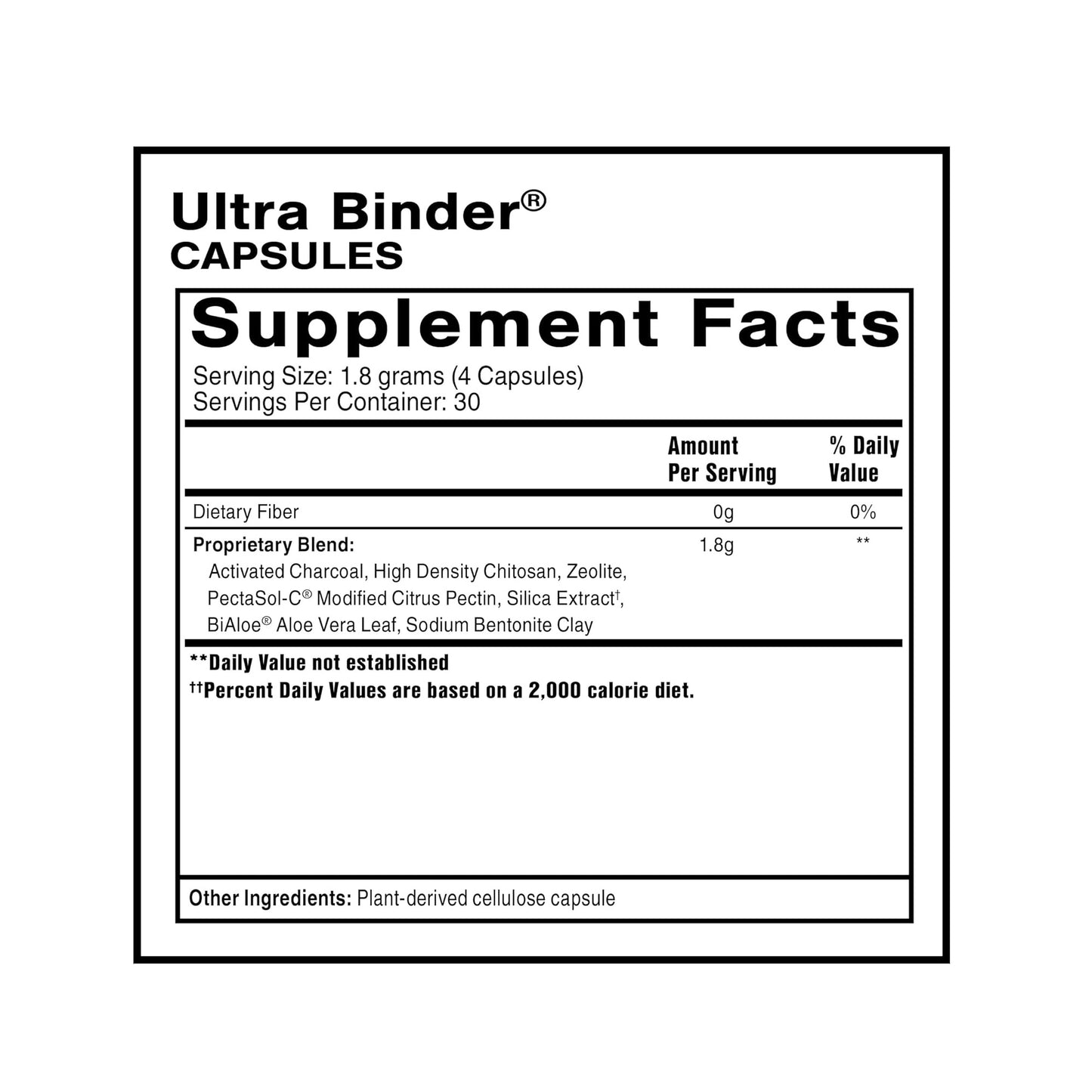 Ultra Binder optimizes the natural elimination of debris and toxins including endotoxin (LPS), metals, and unwanted microbial by-products through the intestines.* Ultra Binder is an optimized combination of USP Sodium Bentonite clay, Activated Charcoal, Chitosan, Fibregum™ Bio (Acacia Gum), BiAloe® (Aloe Vera), and a proprietary thiol-functionalized silica.