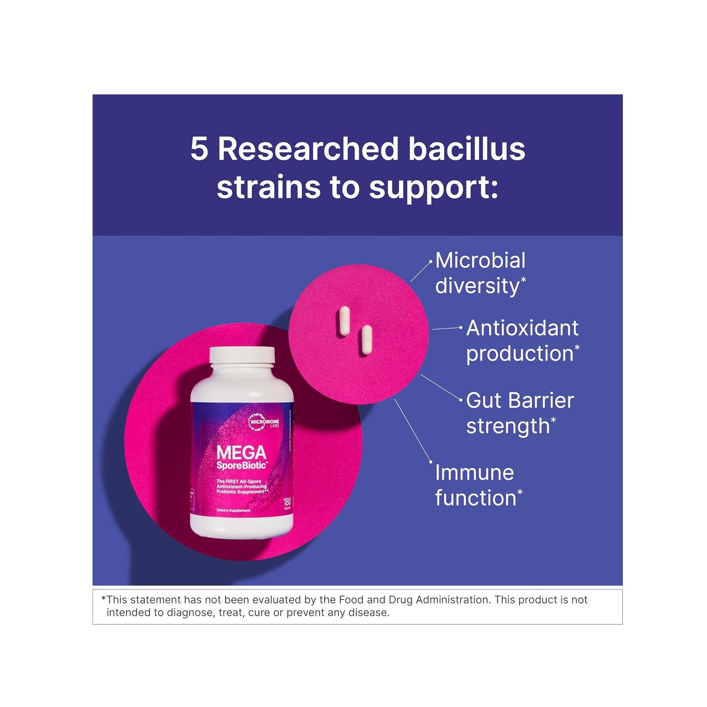 MegaSporeBiotic is a probiotic blend of 5 Bacillus spores that have been shown to maintain healthy gut barrier and immune function. The bi-phasic life cycle of the Bacillus spores allows them to remain dormant in harsh environments until they reach more favorable environments like the human gastrointestinal tract.
