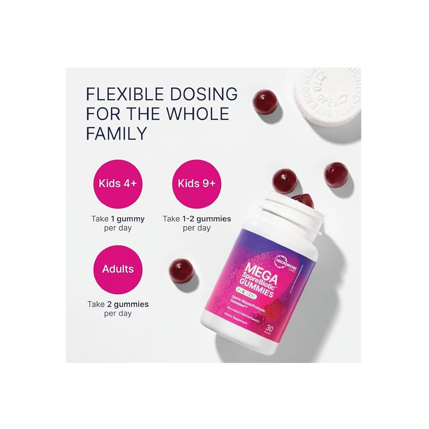 MegaSporeBiotic™ for Adults gummies are a 100% spore-based proprietary probiotic blend that supports a healthy gut microbiome by promoting microbial diversity, maintaining a healthy gut barrier, and supporting the immune system’s protective responses. These delicious, easy-to-digest chewable gummies contain four strains of the beneficial, spore-forming Bacillus bacteria found in Microbiome Labs’ flagship spore-based probiotic supplement, MegaSporeBiotic™. These Bacillus bacterial cultures offer an easy way for the body’s gut microbiome to receive its needed daily support.