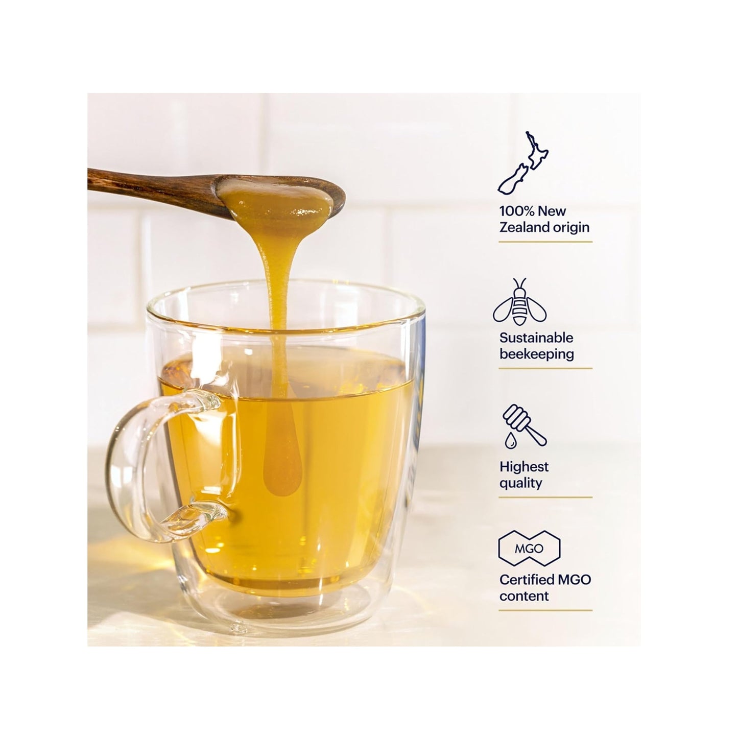 Sustainably sourced from our hives in remote pristine parts of New Zealand and perfected, tested and packed in our specialised honey facility. Our expert care at every step of the process, with the least possible interference, ensures our MGO™ Manuka Honey retains its unique natural properties and has the beautiful taste and smooth velvety texture that has made it a favourite all over the world.