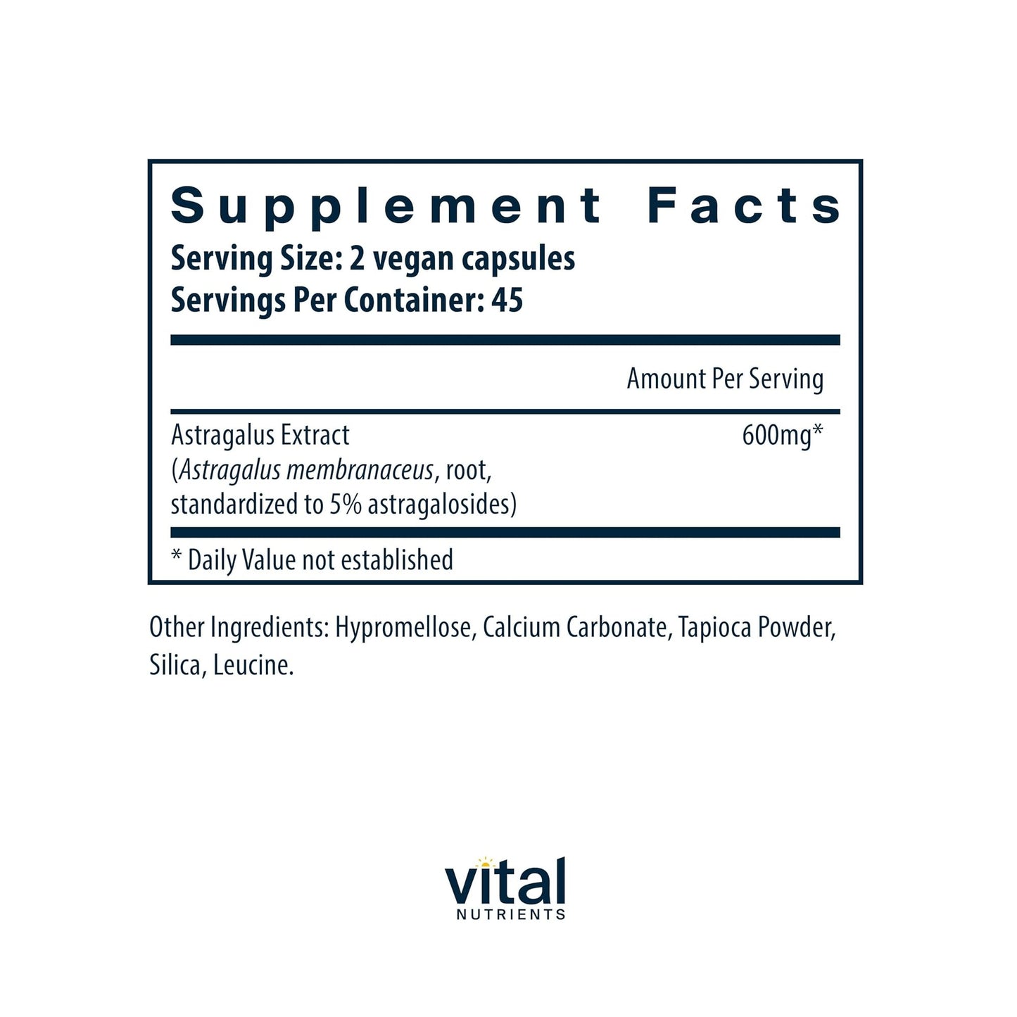 Astragalus Root Extract is a Chinese herb used to support the immune system, promoting normal levels of antibodies, macrophages and immune messenger molecules.* In Traditional Chinese Medicine, Astragalus is used to tonify the spleen, the qi (vital energy), and the blood.* Astragalus Extract has antioxidant effects and helps inhibits free radical production and lipid peroxidation.* It is also very high in trace minerals and micronutrients.* Some preliminary research suggests Astragalus Extract may help support blood sugar levels already in the normal range.* Vital Nutrients Astragalus Extract capsules are vegetarian.