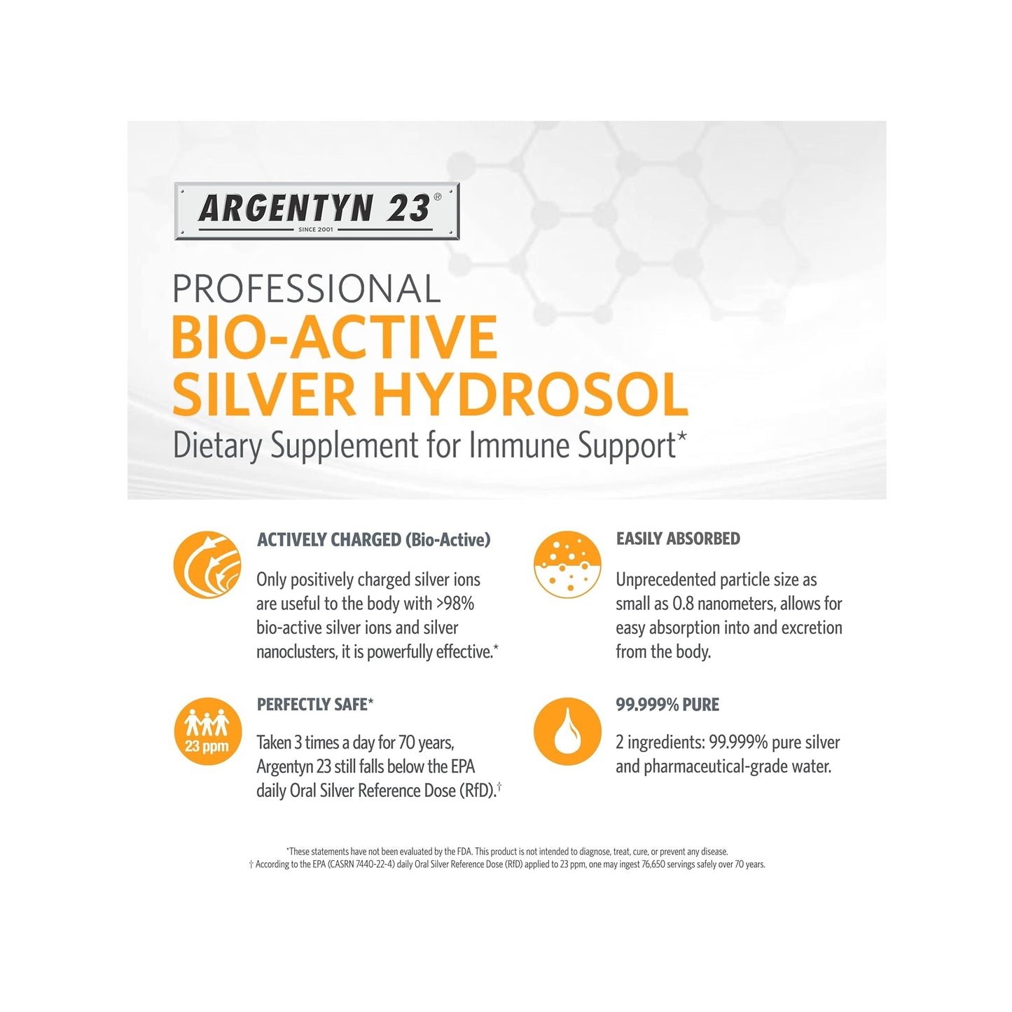 Argentyn 23 is a professional grade of silver hydrosol which is available only through licensed health care practitioners. It represents the ultimate refinement and most significant breakthrough in colloidal technology, having consistently produced the smallest particles ever seen in colloidal silver products, with the most unique charge attributes (98% positively charged). The manufacturing technique is proprietary but particle size and particle charge have been confirmed by third party laboratories and universities. Argentyn 23 does not use additives or stabilizers, nor does it contain salts or proteins (often used to keep silver in suspension, but which create silver compounds). It is pure, meaning it contains only 99.999% pure silver suspended in pharmaceutical-grade purified water. No other manufacturer can make these claims and support them with evidence. "Colloidal Silver" has been used since the late 1800's in countless applications, and encompasses a wide variety of silver products. Many contain (claimed or unclaimed) salts, proteins, compounds or stabilizers - all of which affect the safety and efficacy of silver. Bio-Active Silver Hydrosol represents the ultimate refinement of the colloidal silver category. It contains 98% positively charged silver, in pharmaceutical-grade purified water. Our unique silver species, with a verified and unmatched particle size, remains in its most active state for use within the body.