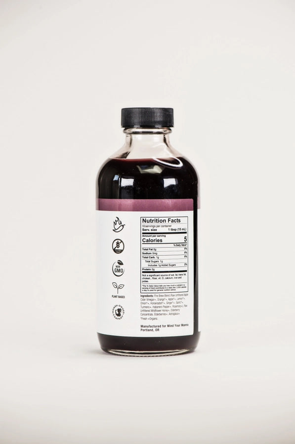 Base: Raw apple cider vinegar, turmeric, ginger, garlic, horseradish, onions, habanero peppers, citrus fruits, apples, rosemary, and wildflower honey. Elderberry Blend Boosts: Elderberries and astragalus root.