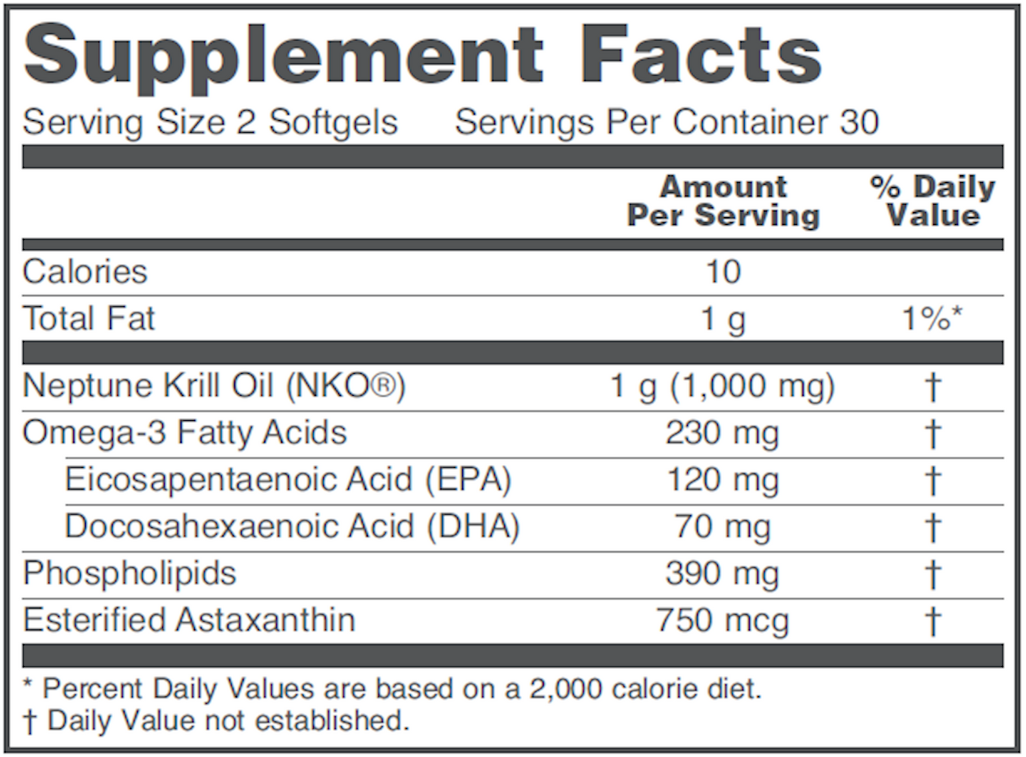 Neptune Krill Oil (NKO®) is known for its unique fatty acid (FA) profile, which includes EPA and DHA, plus phospholipids. In addition, NKO® naturally has Astaxanthin, a powerful free radical scavenger and immune-supporting carotenoid.* Clinical studies have shown that NKO® can help to support joint comfort, healthy blood lipid levels already within normal range, and may help to maintain healthy feminine balance.* The Phospholipid-bound forms of EPA and DHA from Krill Oil have also demonstrated exceptionally high bioavailability.* Neptune Krill Oil is manufactured under strict quality control standards. It is tested to be free of potentially harmful levels of contaminants (i.e. mercury, heavy metals, PCB’s, dioxins, and other contaminants).