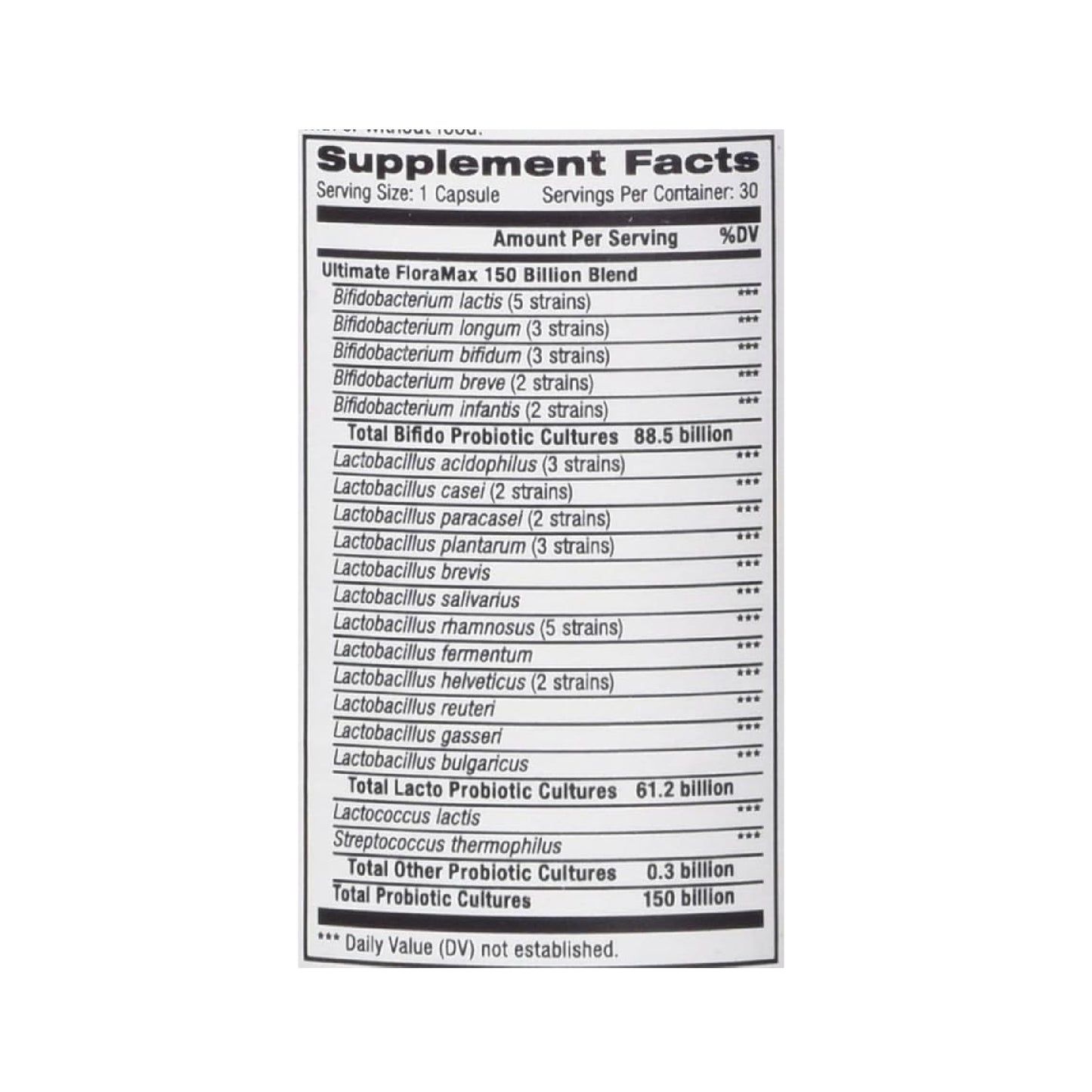 Ultimate FloraMax 150 Billion is a broad-spectrum once-daily probiotic with 150 billion live cultures containing a complex blend of 40 naturally occurring Bifido and Lacto probiotic strains formulated to:
