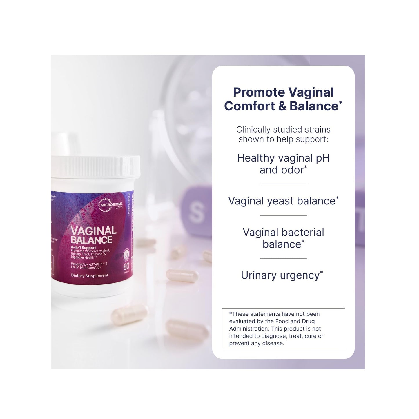 A vaginal microbiome containing low Lactobacillus levels and an overabundance of nonbeneficial bacteria is linked to vaginal discomfort, poor reproductive outcomes, sexually transmitted pathogen colonization, and more. Vaginal Balance probiotic formula promotes healthy yeast populations, optimizes vaginal pH, and reduces bacteria-related vaginal discomfort.**