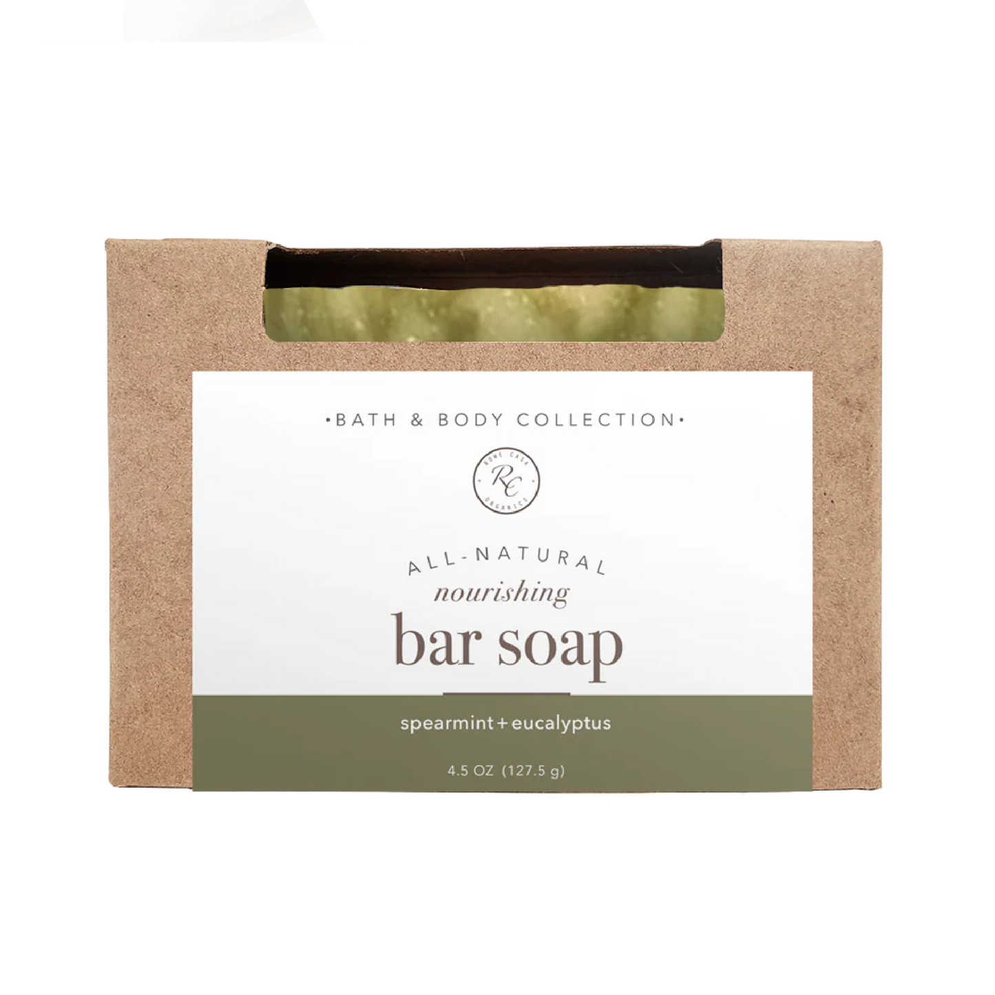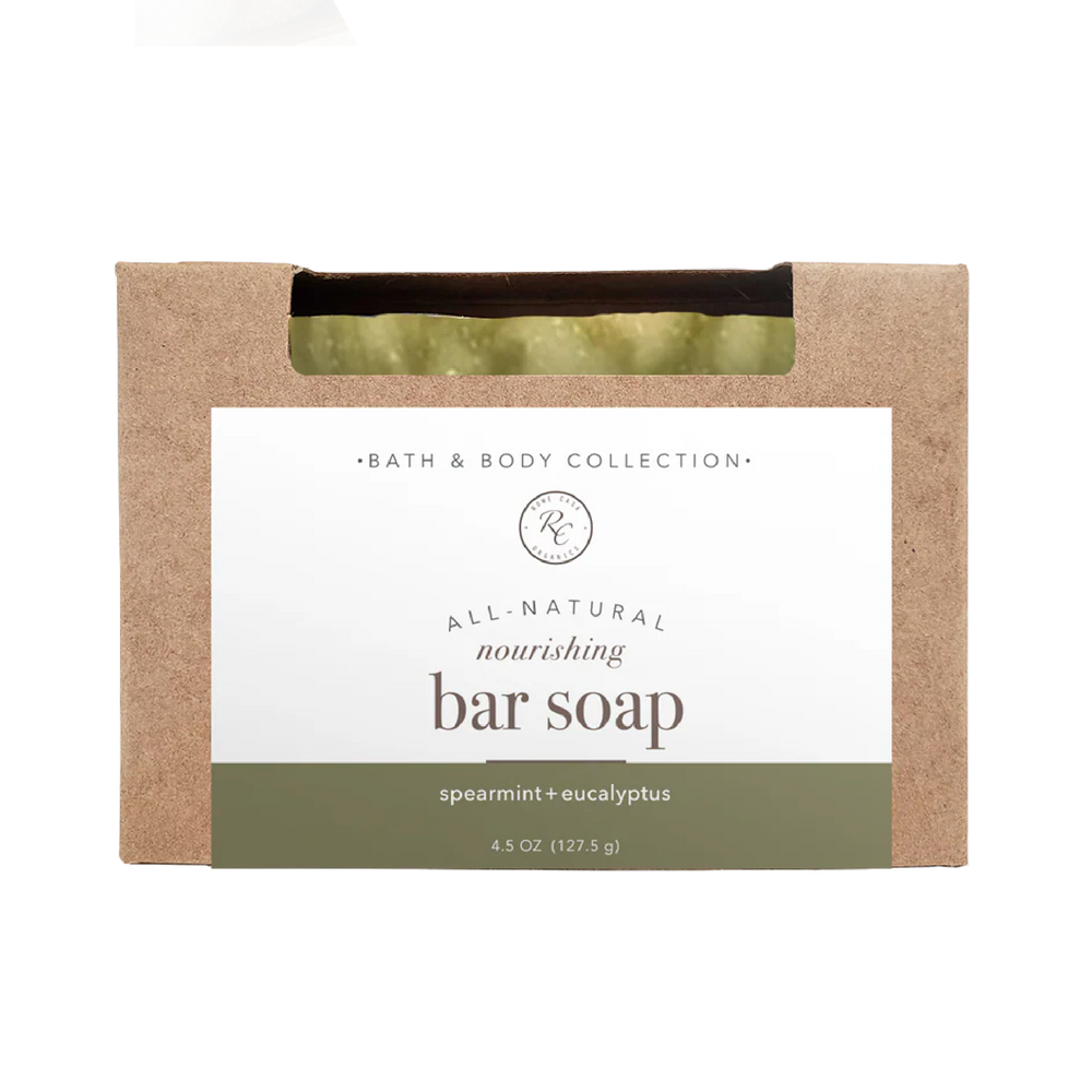 INGREDIENTS: ORGANIC UNREFINED COLD PRESSED OLIVE OIL, ORGANIC RAW UNREFINED COLD PRESSED COCONUT OIL, GOAT MILK, DISTILLED WATER, ORGANIC UNREFINED COLD PRESSED AVOCADO OIL, FOOD GRADE SODIUM HYDROXIDE (LYE), ORGANIC DEODORIZED COCOA BUTTER, RAW SHEA BUTTER, ORGANIC UNREFINED COLD PRESSED HEXANE FREE CASTOR OIL, RAW HONEY, FRENCH GREEN CLAY, KAOLIN, ORGANIC SPIRULINA, 100% PURE, THERAPEUTIC GRADE ESSENTIAL OILS: EUCALYPTUS, SPEARMINT.