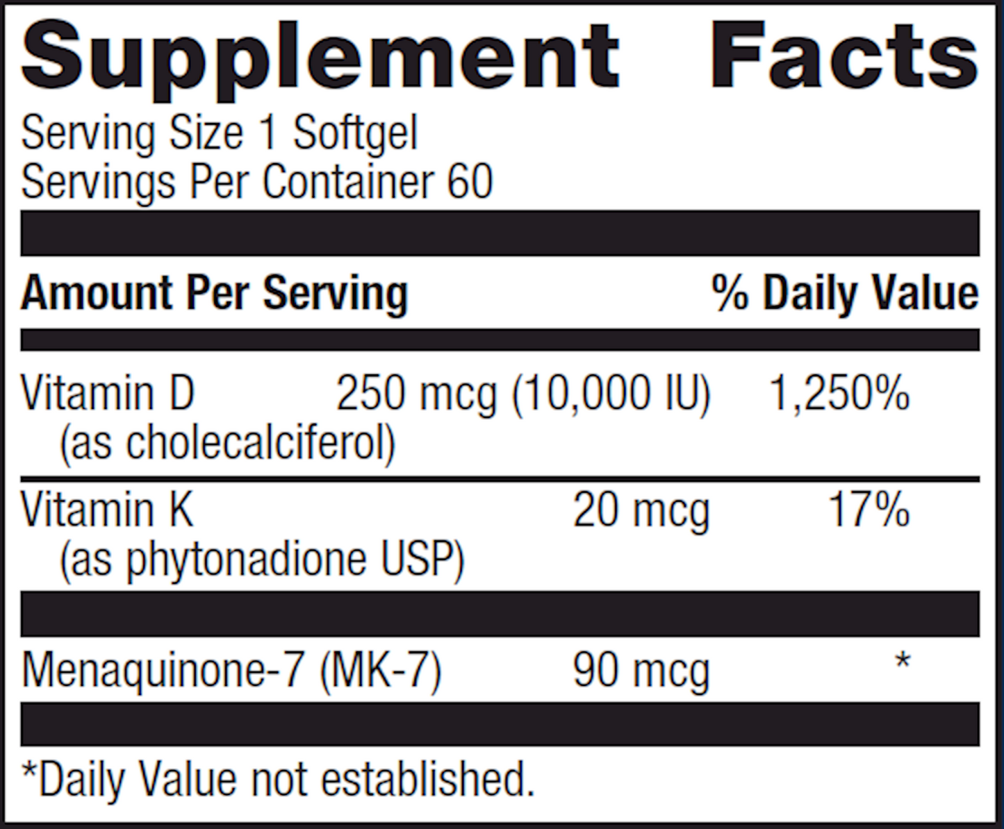 D 3 10,000 with K2 provides 10,000 IU per softgel of vitamin D (as D3), designed for greater absorption. This high potency formula also includes bioavailable forms of vitamin K2 to complement vitamin D.