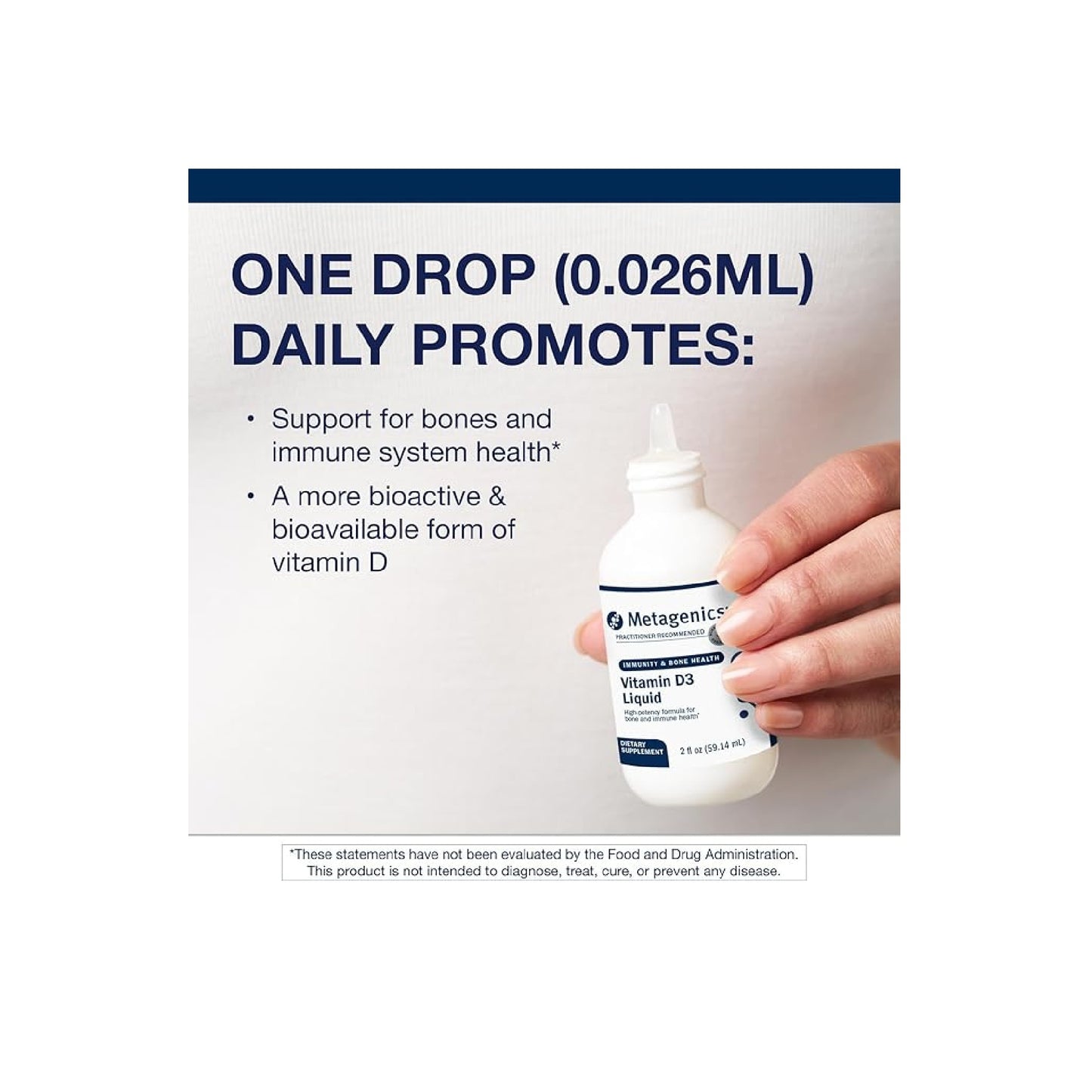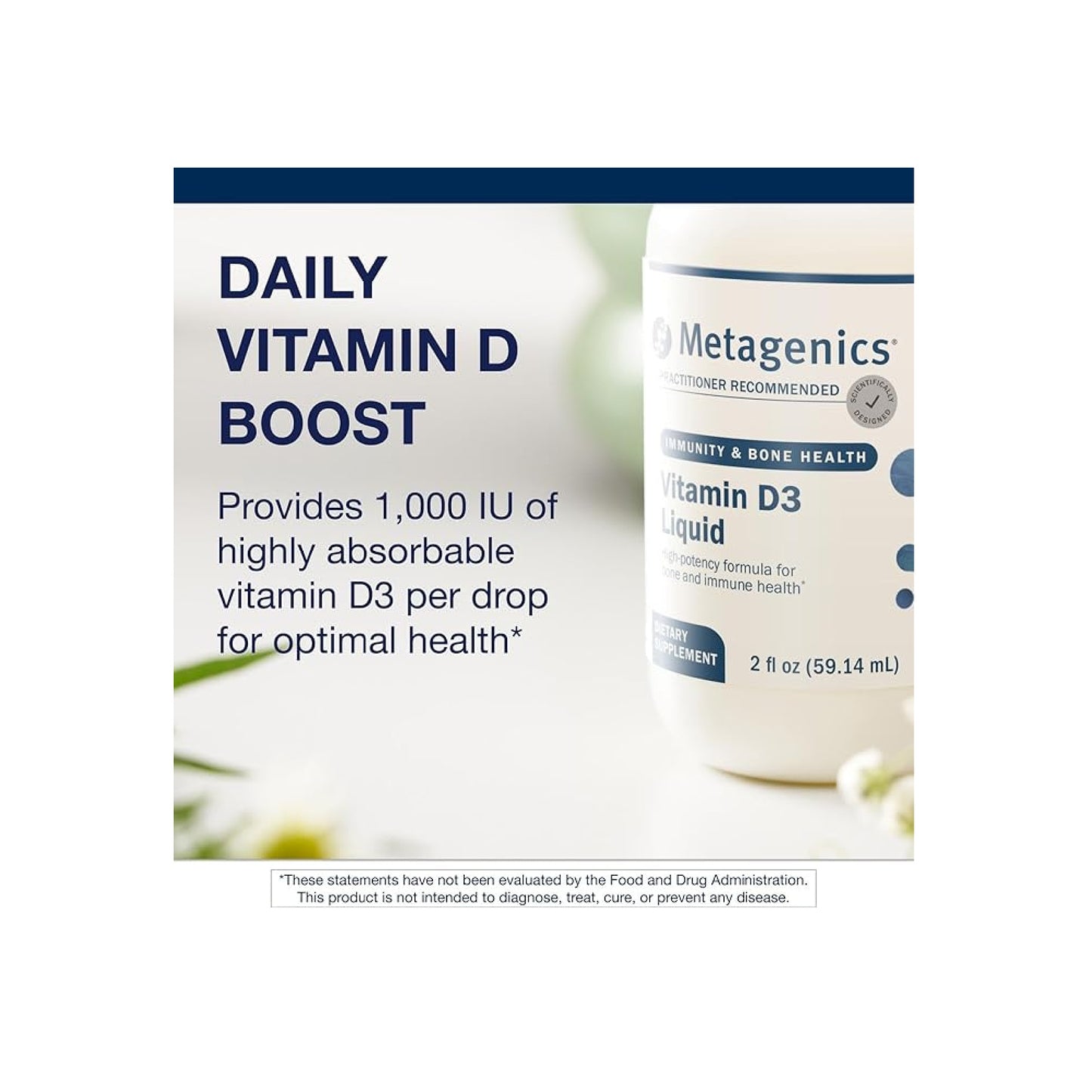 Your body produces natural vitamin D when your skin is exposed to direct sunlight. However, many people don't get enough sun every day, especially during the dark, cold winter months. While minimal amounts can be found in foods like salmon, vitamin D is also available in supplement form for daily use. D3 Liquid from Metagenics is a natural dietary supplement that contains cholecalciferol vitamin D3 to help support your overall immunity and bone strength, and to support optimal overall health as well. It can be difficult to get kids to swallow pills, and Metagenics Liquid D3 solves that problem. This is the ideal liquid supplement for children, and delivers ease-of-use and a great taste. Every batch is made without the use of most common food allergens, and one drop can be taken up to five times every day in support of better health.