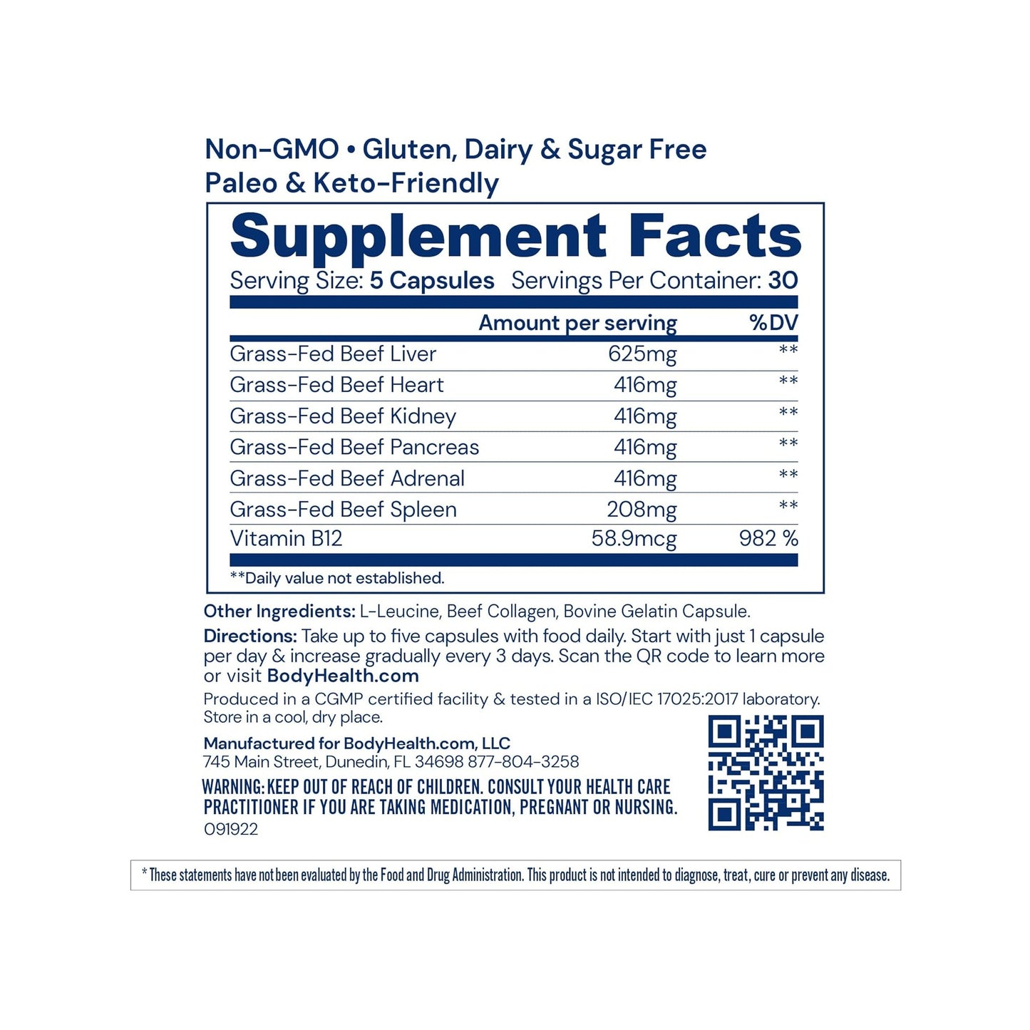 This unique product harnesses advanced freeze-drying techniques to concentrate the nutrient profile of five organs from healthy, grass-fed cows to give you a wide array of critical nutrients known to boost your energy levels, immune system, heart health, brain health, and overall wellbeing. There is no need to eat these organs to enjoy the health-boosting benefits. You can enjoy the convenience of our easy-to-take capsules.
