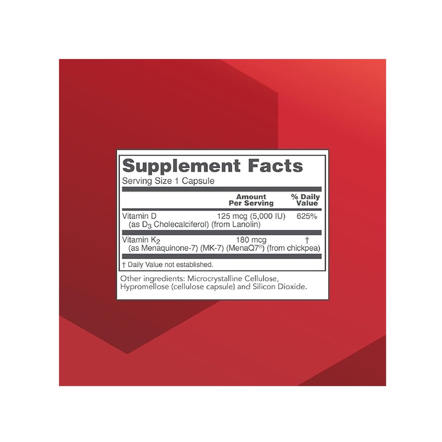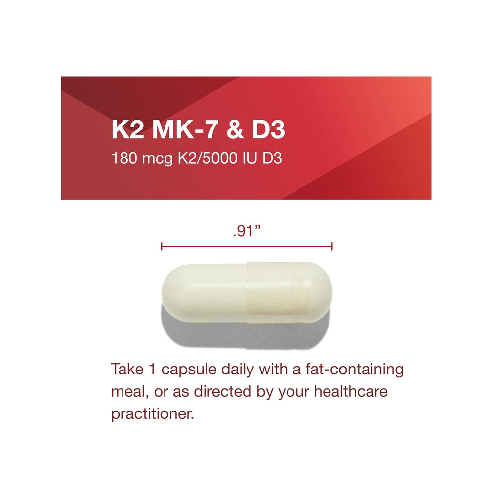 Vitamins D3 and K2 have been extensively studied regarding their roles in calcium metabolism.* Research indicates that a synergistic relationship exists between vitamin K2 and vitamin D3, especially in terms of bone strength and cardiovascular health.* While vitamin D3 is recognized for its role in calcium absorption and metabolism, it is vitamin K2 that directs calcium to bones rather than joint spaces and arteries.* This product is formulated with a clinically relevant dose of MK-7, a unique, soy-free form of vitamin K2 that has been shown to promote healthy vascular structures.*