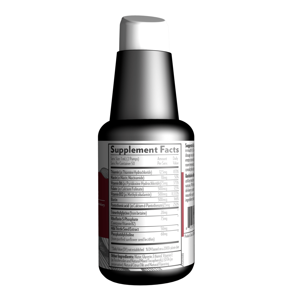 Each 1 mL of Liposomal Methyl B-Complex delivers 12.5 mg B1, 7.5 mg B2, 10 mg B3, 25 mg B5, 7.5 mg B6, 500 mcg B7, 500 mcg B9, 500 mcg B12, 25 mg Trimethylglycine, and 50 mg milk thistle extract. A serving is 2 pumps. Each bottle contains 50 servings.