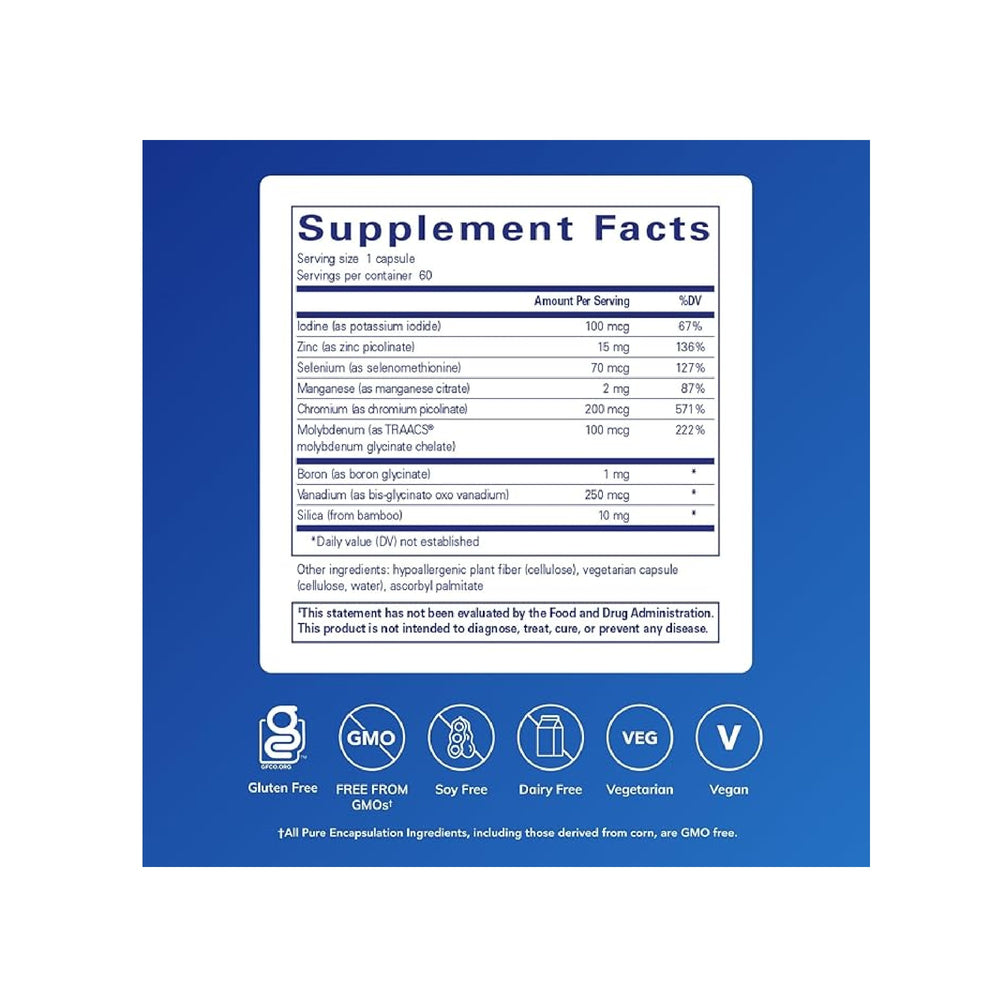 Trace Minerals contains essential minerals to support nutrient metabolism and cellular function throughout the body. These minerals are important enzyme cofactors for numerous processes, including cellular energy production and the synthesis of hormones, neurotransmitters, and DNA. This formula provides trace minerals in a balanced combination, without macrominerals, to promote optimal bioavailability.*