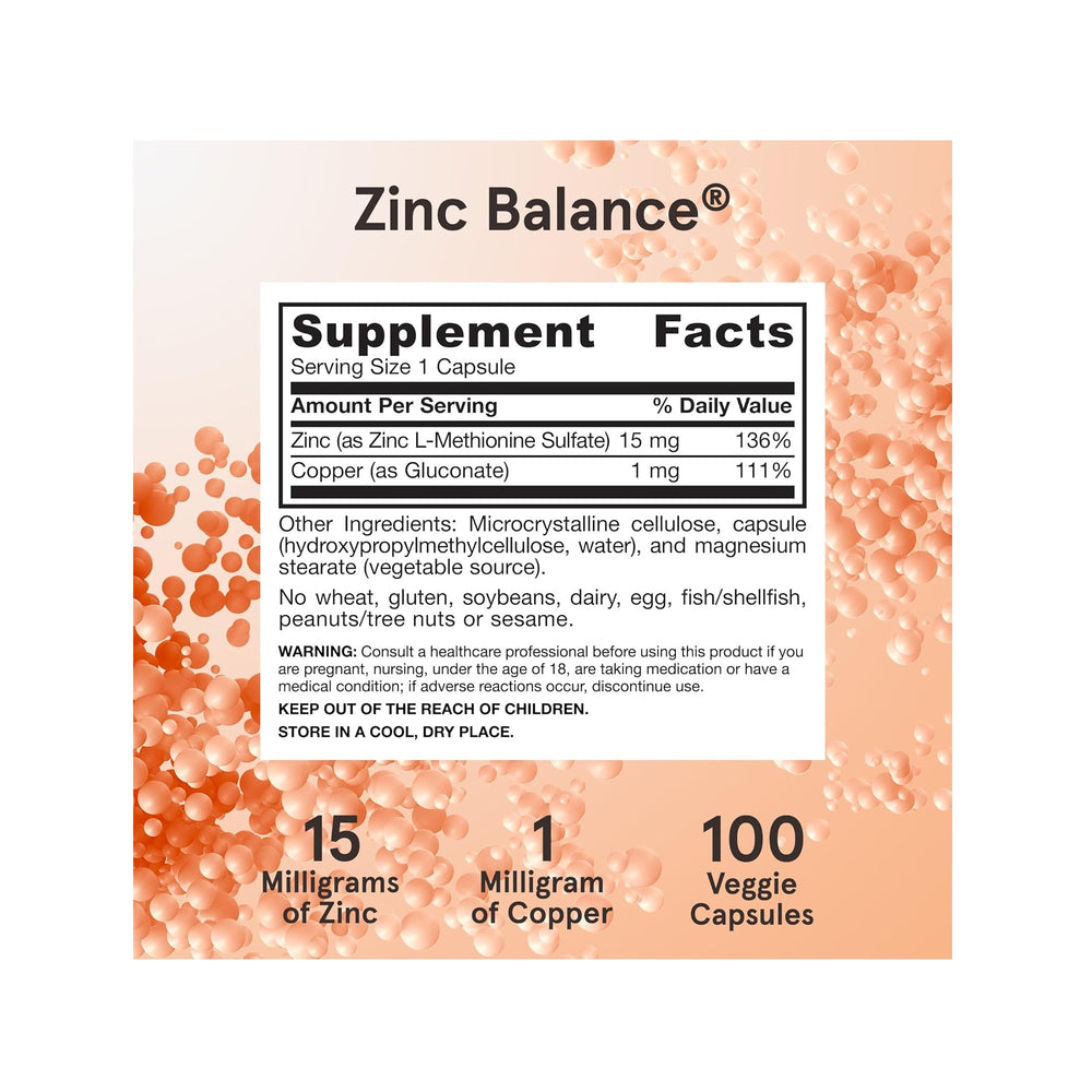 Zinc Balance® is a synergistic combination of Zinc L-Monomethionine and Copper Gluconate in a 15:1 ratio of zinc to copper. Zinc L-Monomethionine resists absorption interference from fiber and phytic acid. The mineral zinc supports skeletal and immune health. Both zinc and copper are needed to support super oxide dismutase (SOD) activity, which plays a critical role in the body’s endogenous antioxidant network.