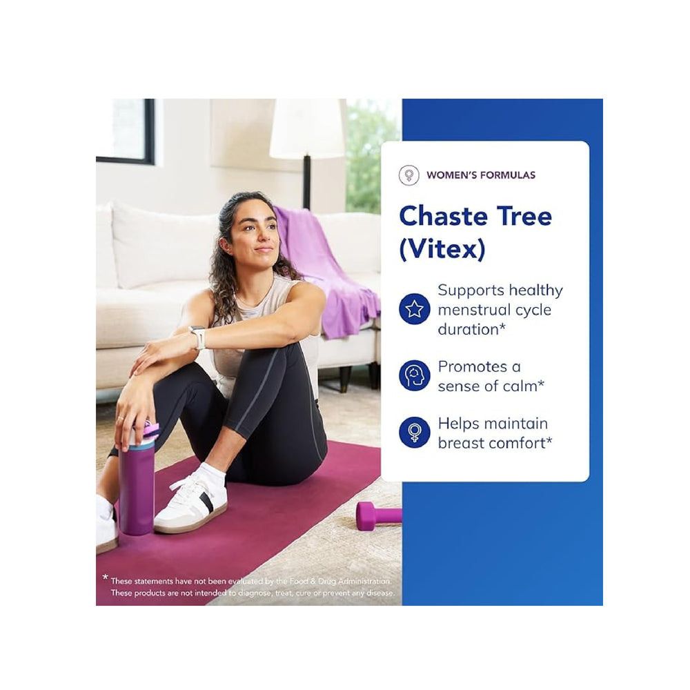 Chaste tree extract, also known as Vitex, contains flavonoids, iridoid glycosides, and terpenoids. It has been associated with supporting breast comfort and positive mood during the menstrual cycle, as suggested by numerous randomized, double-blind, placebo-controlled trials. It has also been associated with promoting healthy menstrual luteal phase length and menstrual regularity for some women, helping to maintain healthy reproductive system function.*