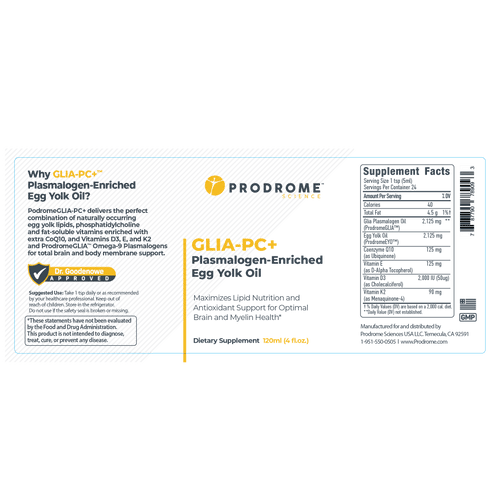ProdromeGLIA-PC+ delivers the perfect combination of naturally occurring egg yolk lipids, phosphatidylcholine, and fat-soluble vitamins enriched with extra CoQ10, Vitamins D3, E, and K2, and ProdromeGLIA™ Omega-9 Plasmalogens for total brain and body membrane support.