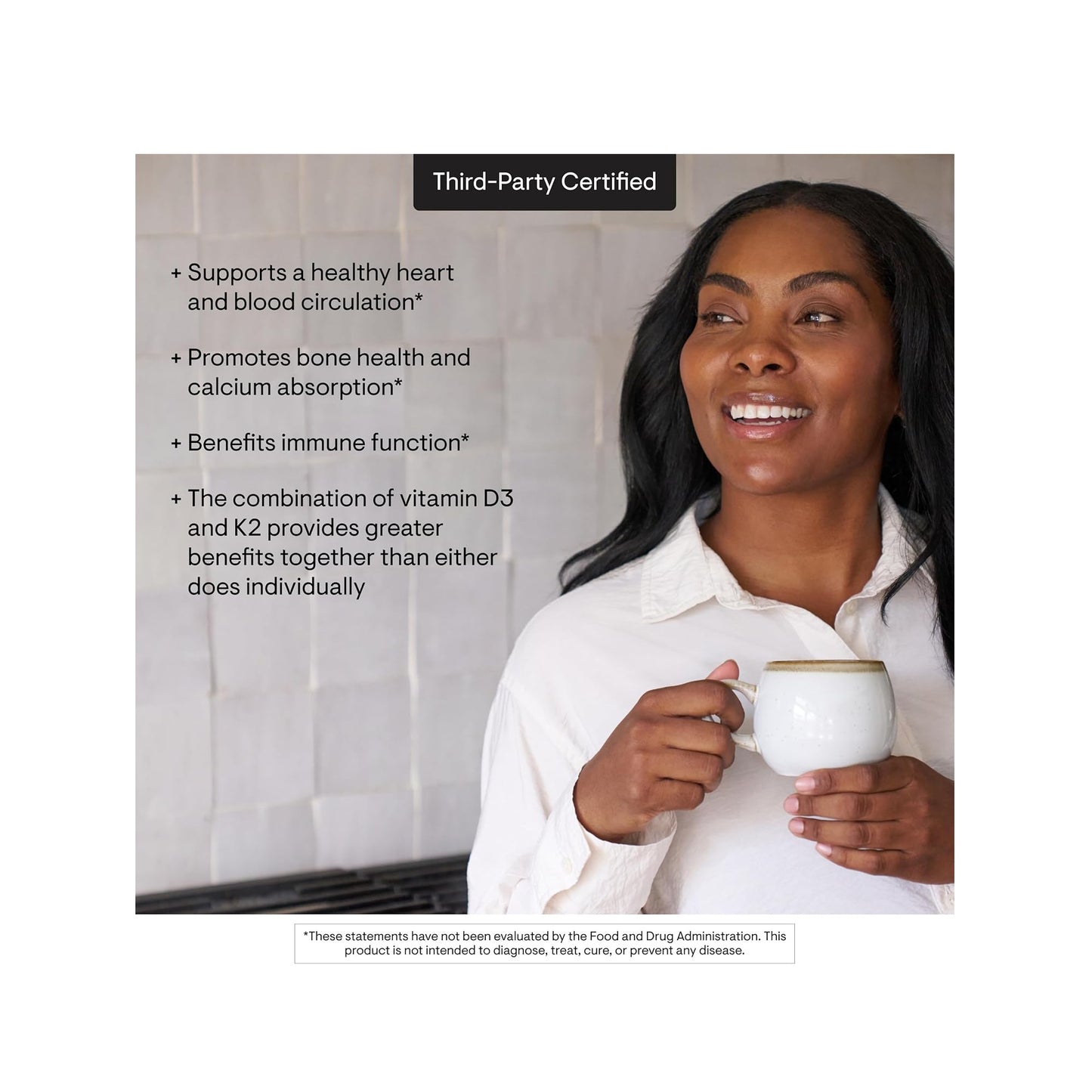 Vitamin D/K2 Liquid is a convenient way to supplement with both vitamins D and K2, which offer greater support for bones and the immune and cardiovascular systems together than either does individually.* For example, vitamin D is necessary for calcium absorption, and vitamin K is important for directing calcium to the bones and away from the soft tissues, such as blood vessels and kidneys.*